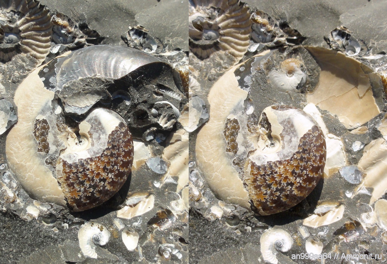 Аммониты любили хорониться внутри аммонитов )) Но на самом деле я очень сомневаюсь, что он сам туда заплыл - аммониты дураками не были, чтобы лезть в такую щель, да и жили не у дна, а у поверхности. Скорее всего течением раковины заносило. | ||||||