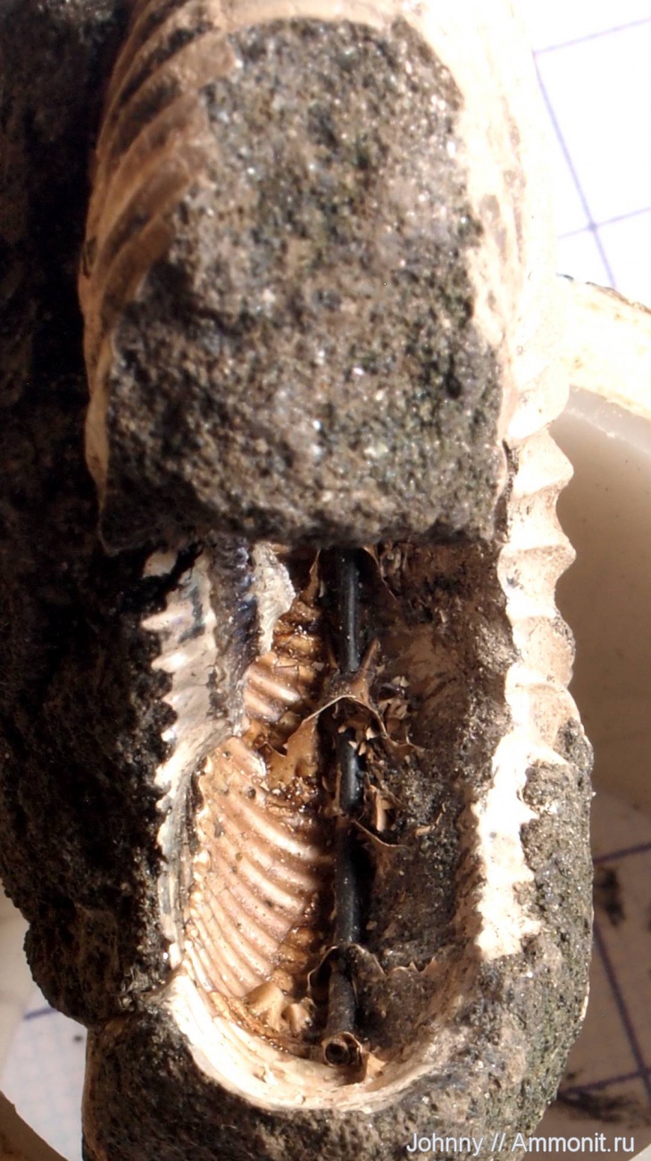 Попался вот такой Epivirgatites - сохранилась жилая камера и отпечаток внутренних оборотов. А на дорсальной стороне жилой камеры сохранились фрагменты предыдущего оборота с сифоном и перегородками. Карамышевская набережная.