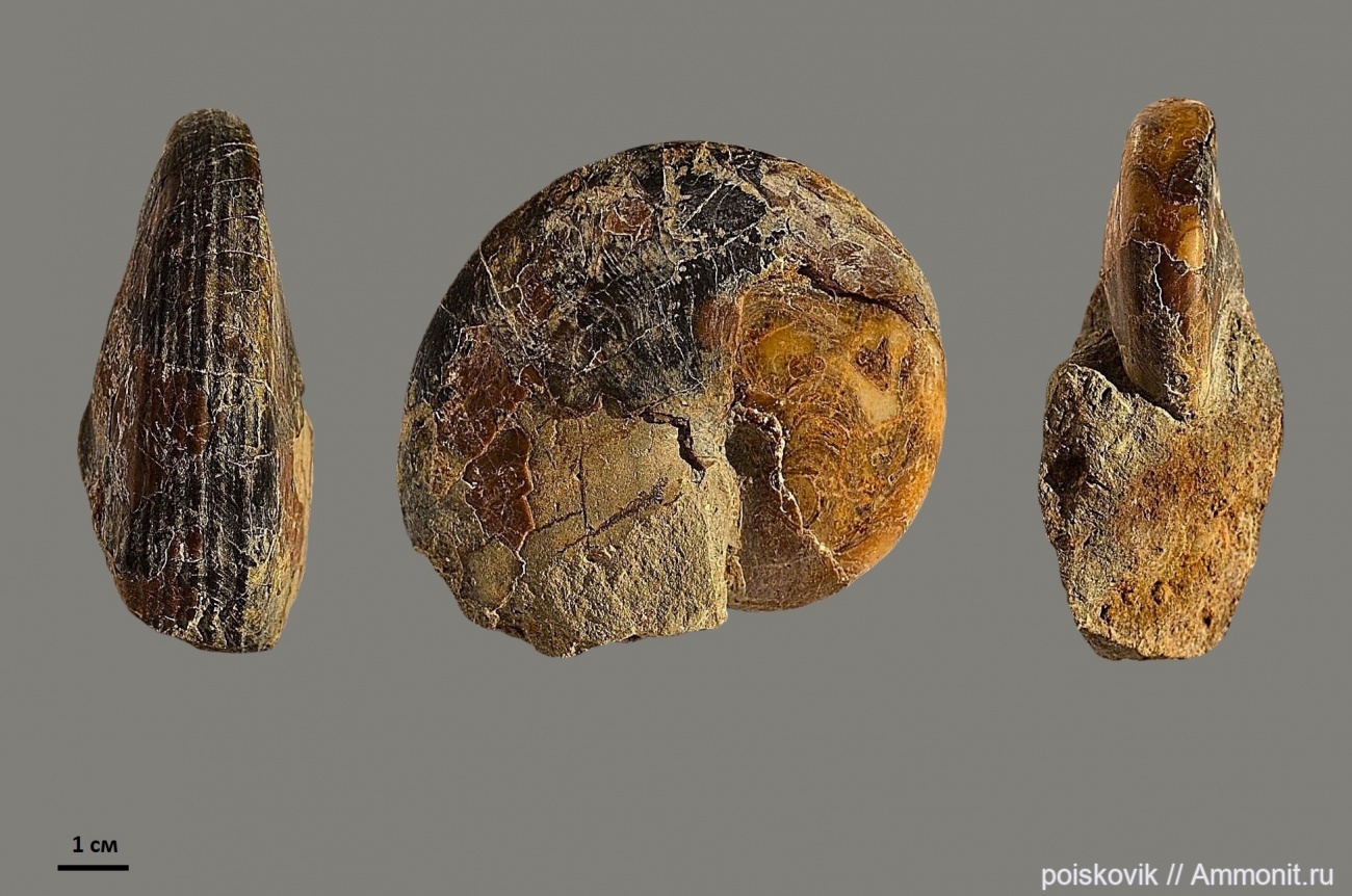 Наутилус диаметром 9см. На вентральной поверхности раковины - шесть четко выраженных продольных ребер. Берриасс. Окресности села Балки.