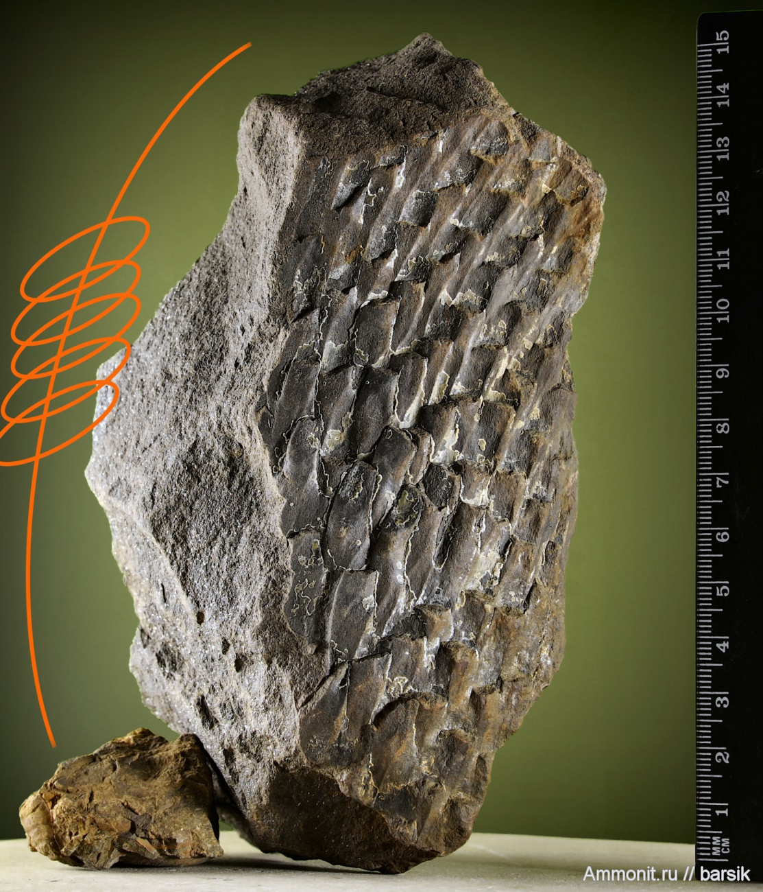 Эта находка попалась впервые и определить её не удалось. Очень интересная витая спирально- выгнутая структура поверхности, которая больше всего напоминает места крепления листьев. Что это - часть ствола папоротника без листьев - фото («Палеоботаника» Криштофович А.Н)., ствол пальмы или основание шишки. Споровая шишка лепидодендрона могла достигать в длину 70см.
