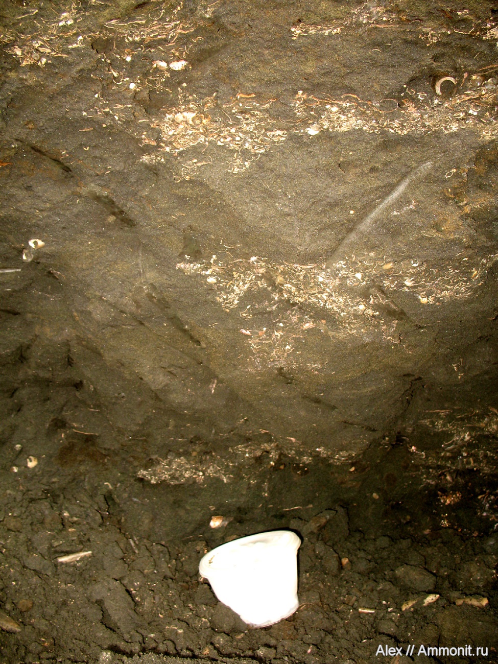 В ракушняке какая-то двустворочно-брахиоподовая труха и те же Kachpurites давленные. В одной из верхних линз (где справа срез белемнита), там же видны поперечные срезы аммонитов. Они там такие мягкие, что извлечь их нельзя, приходится стенку счищать вместе с ними. | ||||||