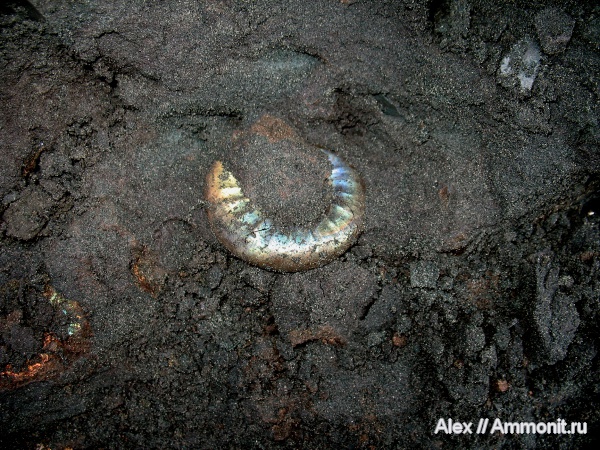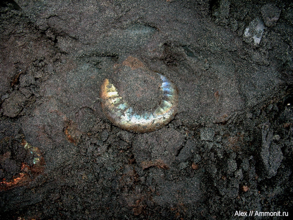 Умеренно ребристый макроконх Kachpurites fulgens с отпечатком мускула (заостренный оранжево-желтый след на перламутре внизу справа) в раскопе в Еганово. Аммонит свежий, только что найденный и очень яркий. Диаметр 6 см.