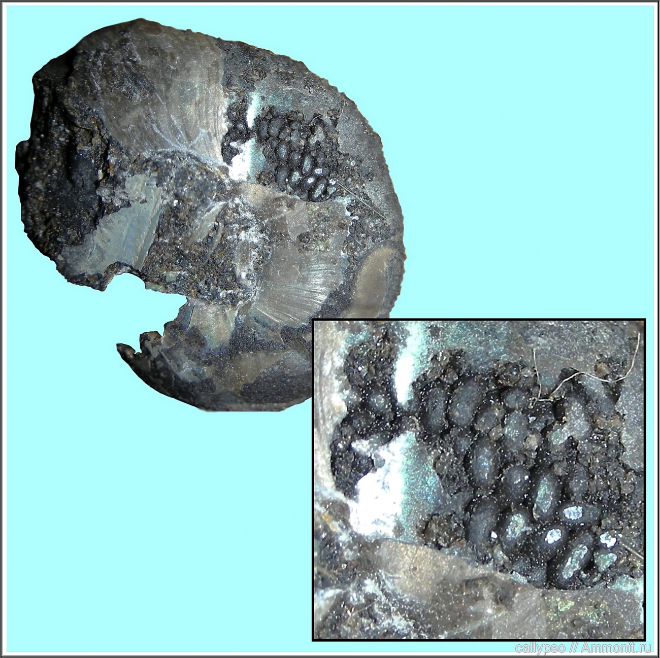 Интересная находка! Аммонит Kachpurites subfulgens. А штуки эти - на мой взгляд вероятнее копролиты, форма у них уж очень вытянутая. Если бы были яйца на самой ранней стадии, вряд ли бы они сохранились, а если бы на поздней - аммонителла более шарообразная, ее было бы видно. Да и аммонит мелкий, макроконхом быть не может. Может конечно кто-то посторонний отложил яйца в пустую раковину, но форма все-таки больше копролитовая. | ||||||
