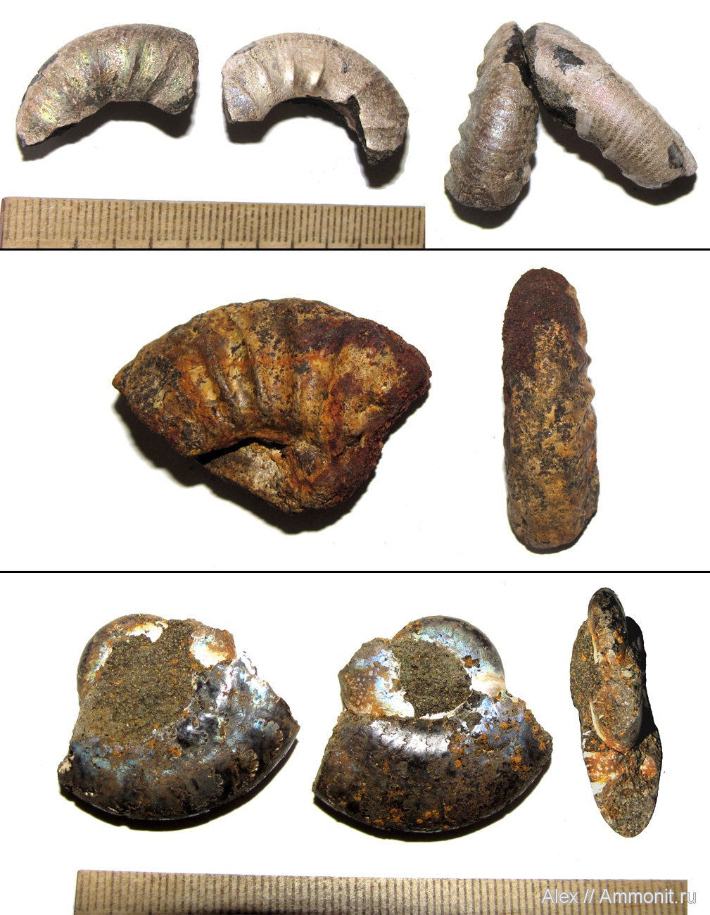 В верхнем ряду аммониты Kachpurites fulgens ребристого морфотипа. Как правило, такую ребристость имеют макроконхи - крупные аммониты, у которых заметные ребра часто появляются только на внешних оборотах. Но эти образцы интересны тем, что они мелкие, и это не фрагмоконы, а жилые камеры. Правда, сложно сказать, умерли ли они взрослыми или попали на обед хищникам еще в молодости - обе раковины найдены в виде фрагментов, рядом с которыми других обломков не было.