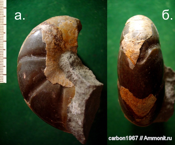 На раковине пережимы тоже должны быть видны, но очень слабо. Это какой-то Desmoceras из семейства Desmoceratidae. | ||||||