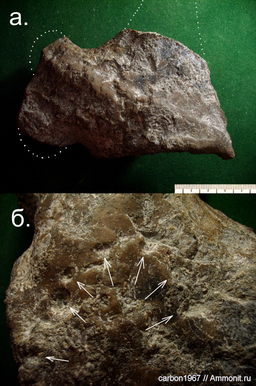 Действительно очень похоже на укус. Знать бы, у кого там зубы такие были, чтобы раковину проломать. Рыбоядный завр за нее и браться не будет, тут видно кто-то специализирующийся на твердой пище. | ||||||