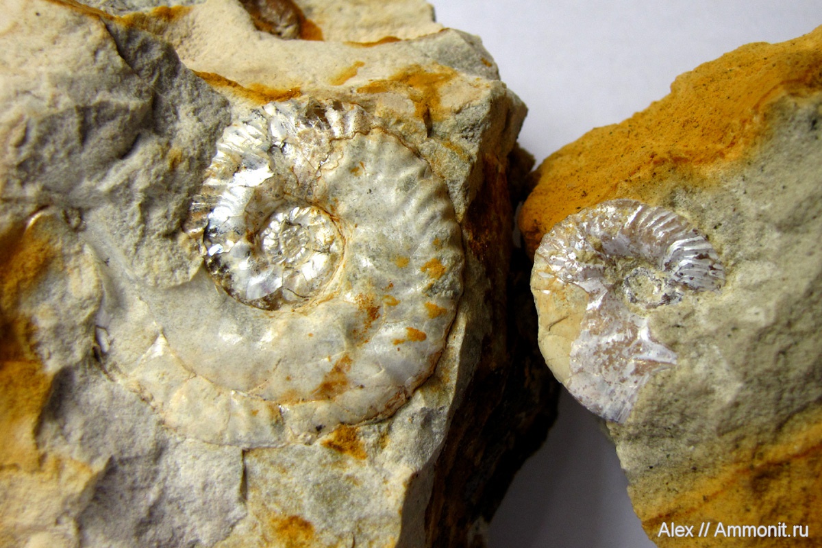 Правда, для этого фото я выбрал две крайности, в среднем эти аммониты заметно крупнее правого образца и несколько меньше левого. В названии фото слово "диморфизм" взято в кавычки как раз потому, что у сутнерий большие и маленькие микроконхи не образуют две отдельные группы. На графике их распределение по размеру соответствовало бы классическому нормальному распределению, у них относительно мало очень больших и очень маленьких аммонитов и много среднеразмерных.