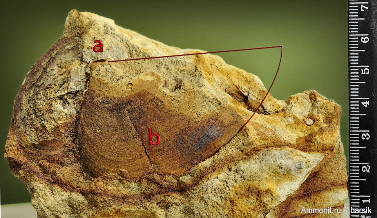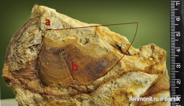 До этого я их видел только на фотографиях. Сильно похож на двустворку и еще интересен тем, что сохранился угол (а) с направлением линии соединения аптихов и можно примерно представить общую конфигурацию и еще на отпечатке было какое-то повреждение(b). На дополнительном фото хорошо видно, что это не трещина при захоронении, а прижизненный шрам - линии нарастания тоже меняют направление в районе царапины.