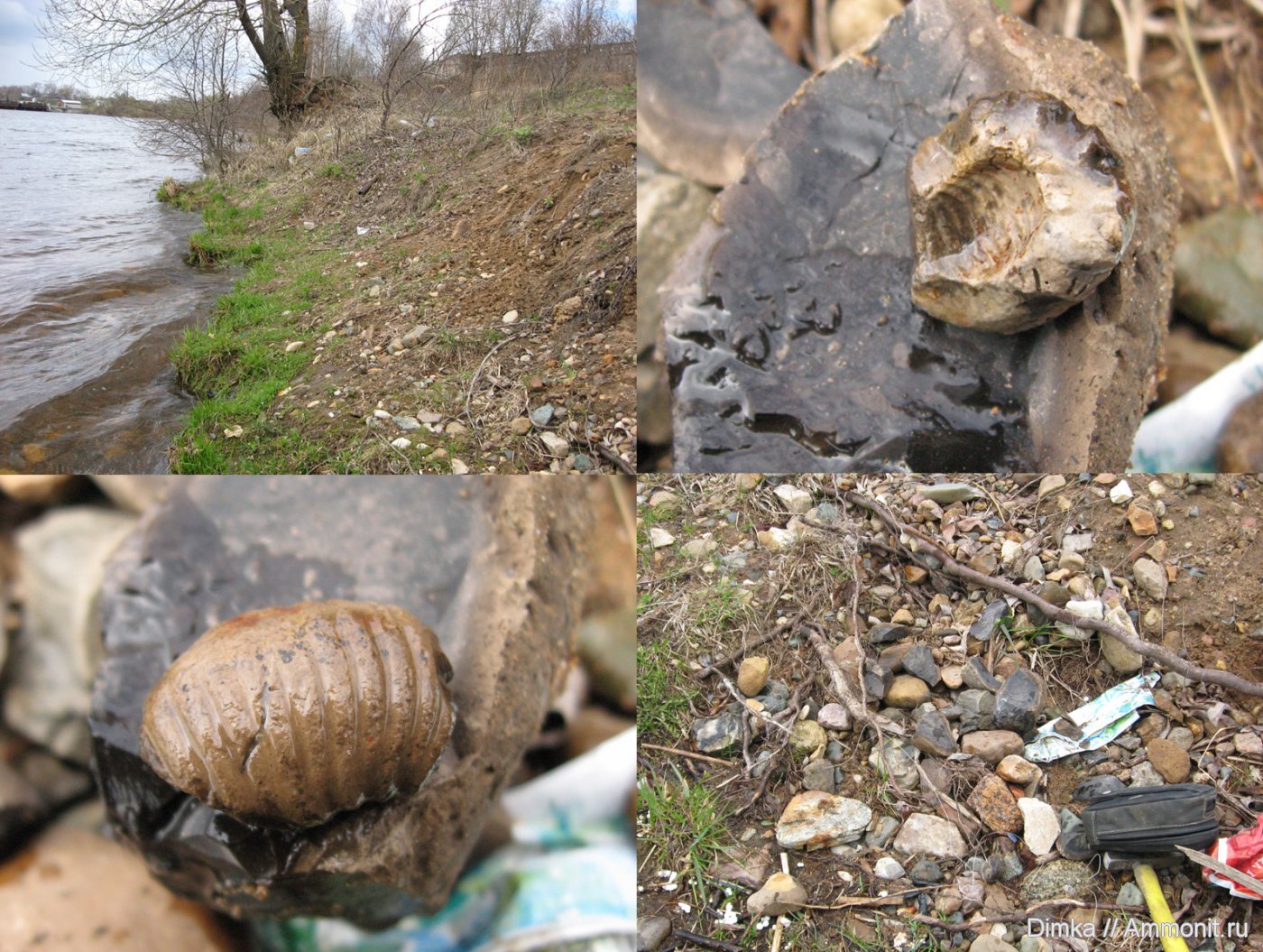 Нашел прямо на берегу несколько конкреций (оксфорд или келловей), очень плотных, но пустых, только с прожилками пирита и один обломок аммонита, скорее всего Quenstedtoceras pavlovi.