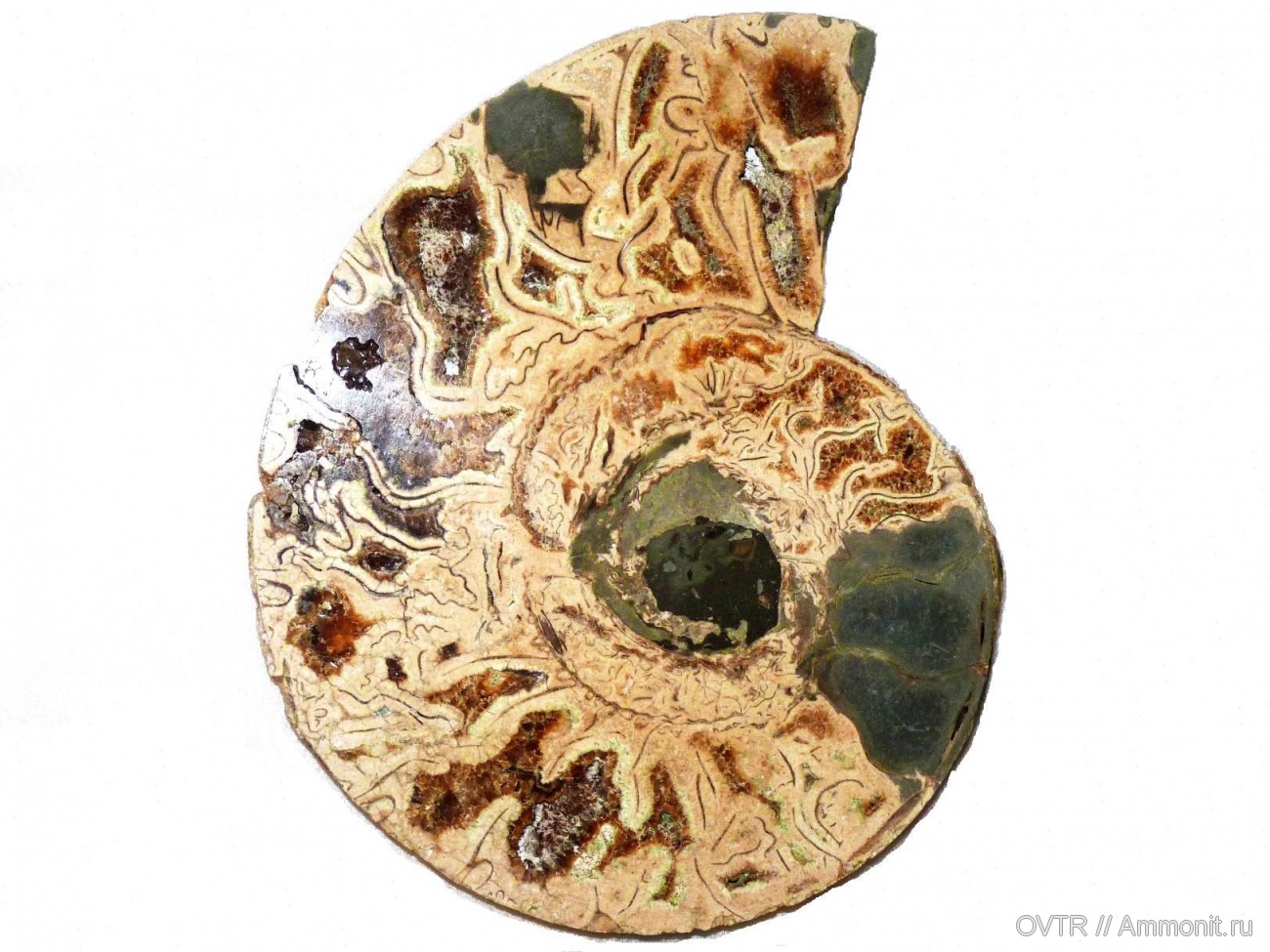 Полировка среза филлоцератиды 30 см. Центра не было, пришлось залечить. Обратите внимание на расположение перегородок: аммонит был давленный, перегородки расположены неправильно, но всё же образуют неповторимый рисунок, и в этом есть своя прелесть.