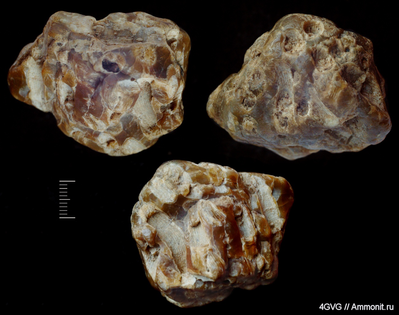 Стенки коралла. Один образец с разных сторон. Вмещающая порода - халцедон. Силур-Девон