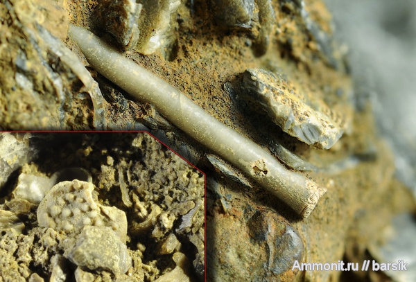 Фрагменты очень маленькие – панцирь(если это панцирь) размером со спичечную головку, игла – диаметр 0.5мм. Или это может быть от брахиоподы?