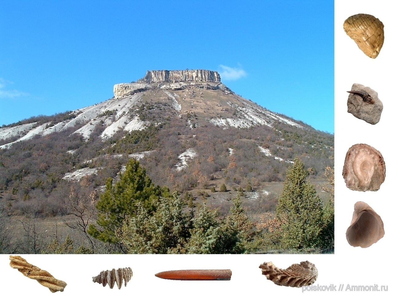 Гора Тепе-Кермен (44°42'56''N; 33°55'50''E) возвышается на 520 метров над уровнем моря. Вершина конусообразной горы представляет собой скалистое образование, сложенное мшанковыми известняками дна мелового моря. В отвесных скальных породах и в осыпях у ее подножья встречаются: морские ежи, белемниты, двустворчатые моллюски, зубы акул, губки и т.д.