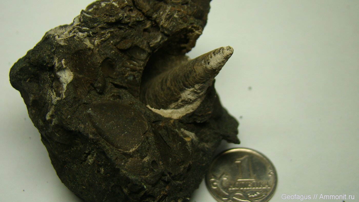 Фрагмокон белемнита найден в черной юрской глине у реки Шмелёвка, Москва