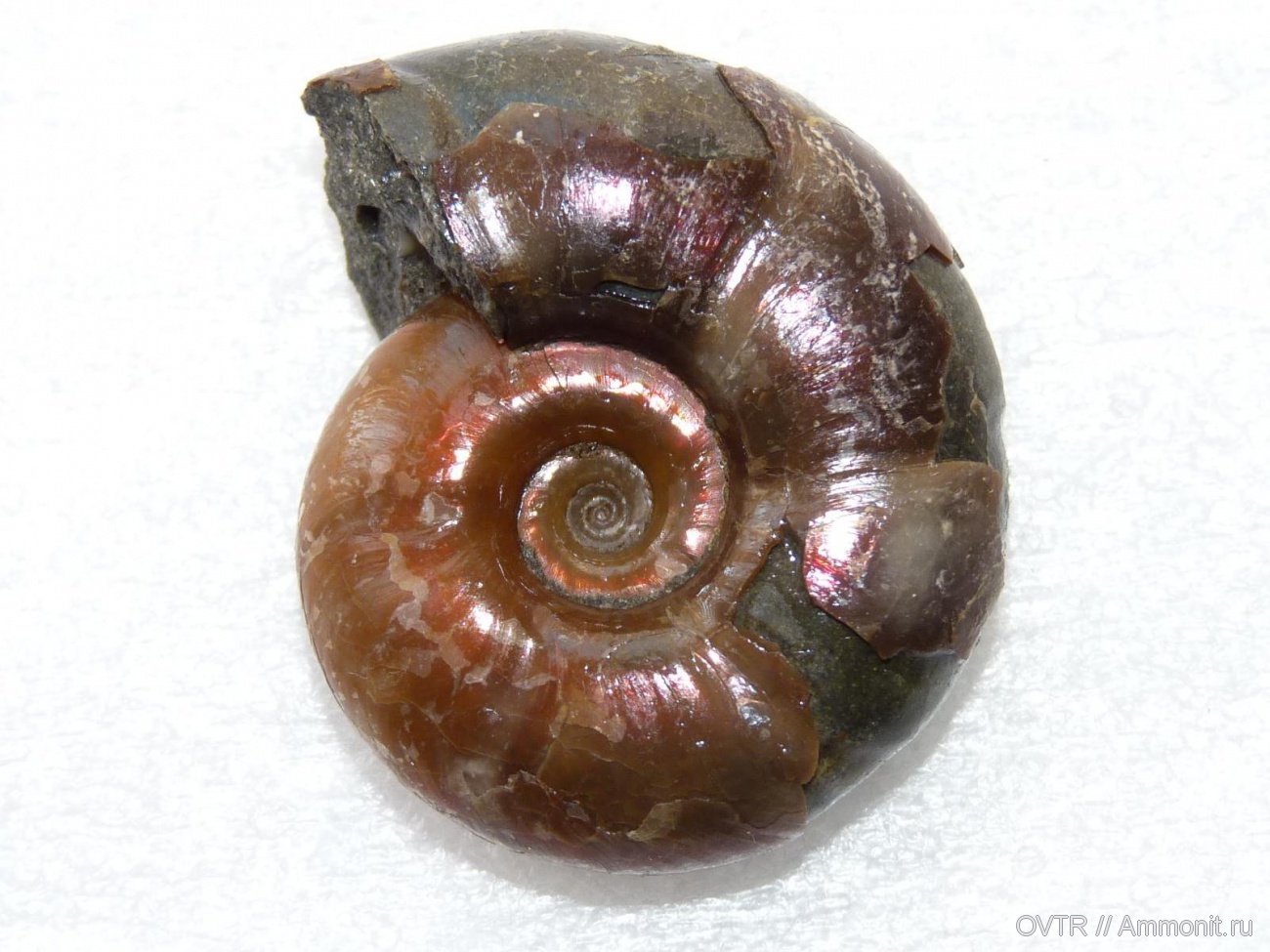 Zuercherella 36мм. Хорошо видно, что перламутр - всего лишь часть тонкой кальцитовой корочки. Аммонителла в наличии. Этот образец отсюда: http://www.ammonit.ru/text/518.htm