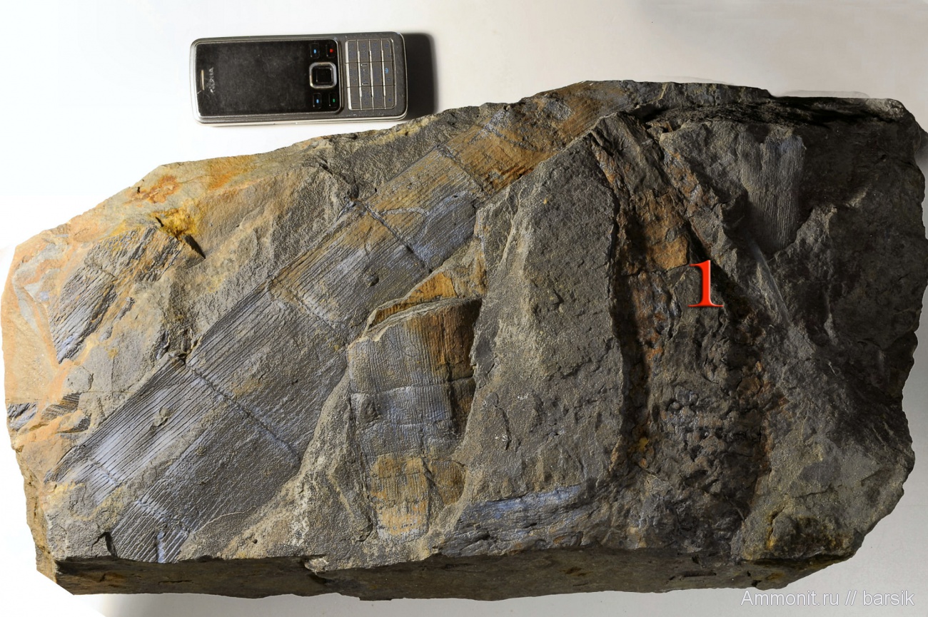 Камень большой, килограммов на 20, весь в каламитах. По размеру приближается к образцу уважаемого Романа Calamites Goepperti . Качеств, конечно похуже. Меня больше заинтересовала какая-то большая рыхлая шишка справа (1). Но, к сожалению сильно разрушено, и о природе этого образования можно только догадываться.