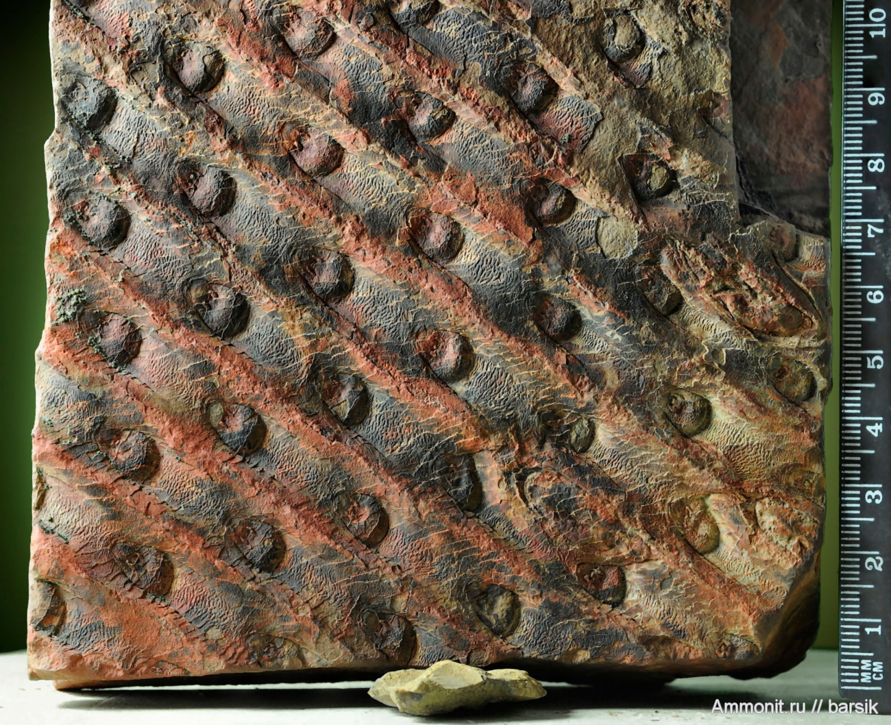 На снимке негативный отпечаток лицевого слоя коры с листовыми рубцами. Кроме хорошего размера плиты и детального сохранения, образец интересен еще и тем, что сохранились места крепления спороносных шишек.