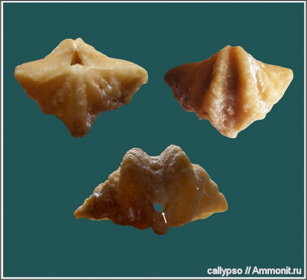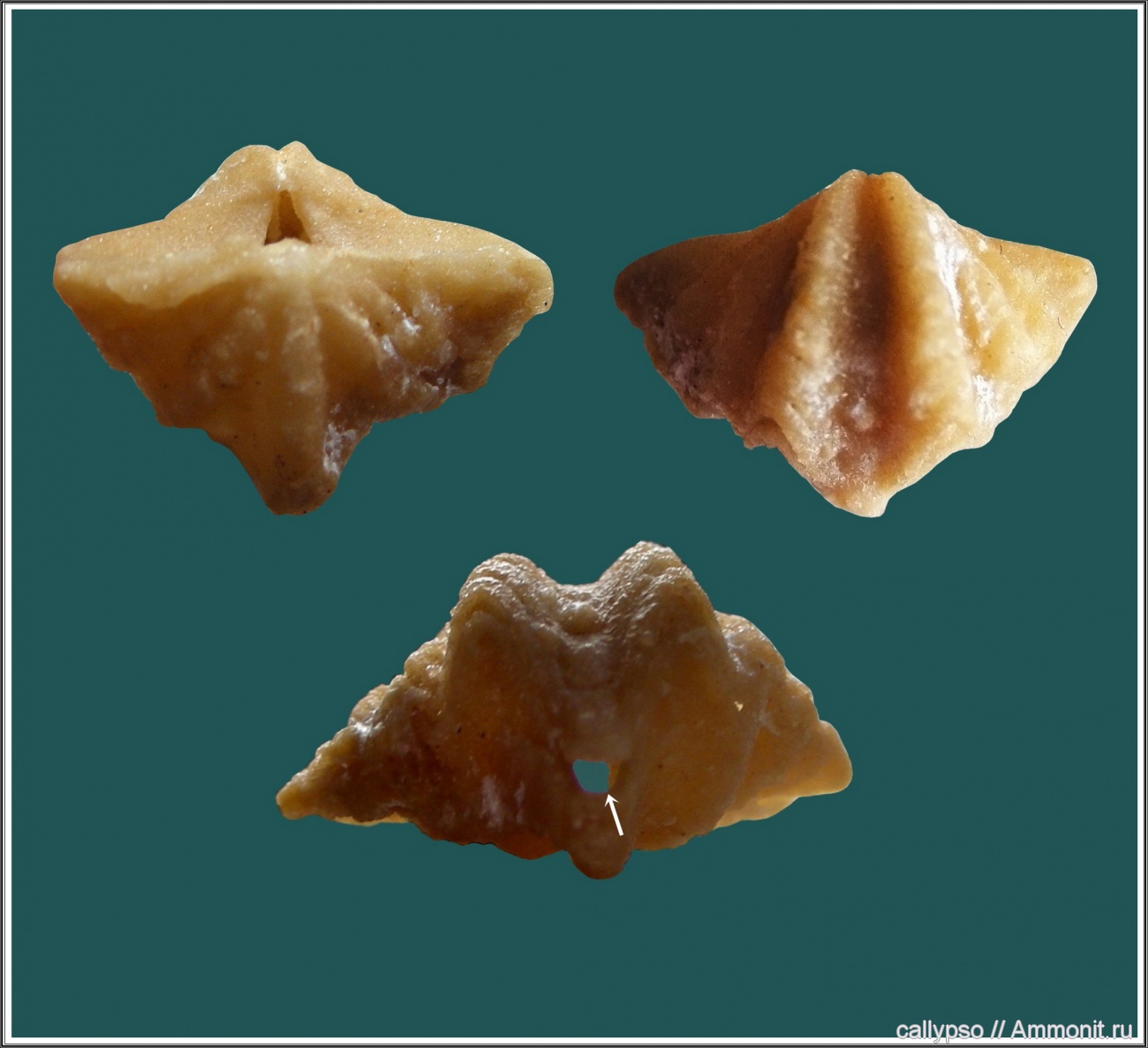 Стрелочкой показан чуть приоткрытый смычный край, через который видно сквозное отверстие с выходом через дельтирий (раковина "пустая", т.е. не заполнена вмещающим осадком).