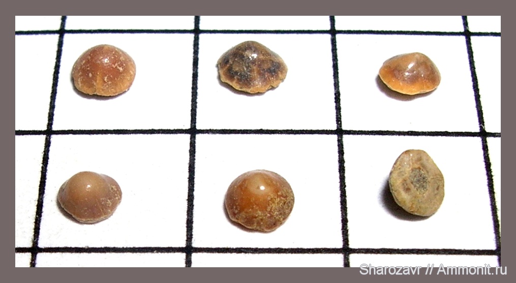 Зубки из низа камышинской свиты. Но в отличие от предыдущих, имеют не уплощено-сферическую коронку, а коническую. То ли расположены в челюсти были в другом месте, то ли вид другой. Клетка 5 мм.