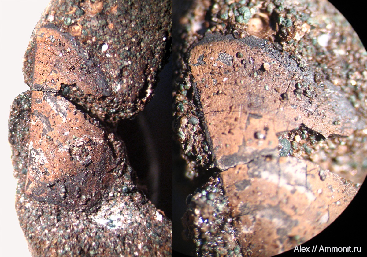 Да, через бинокуляр. Сам аптих можно конечно и обычной макросъемкой, но кальцитовый слой все-таки только через бинокуляр нормально получается. А глауконита в этих слоях очень много! | ||||||