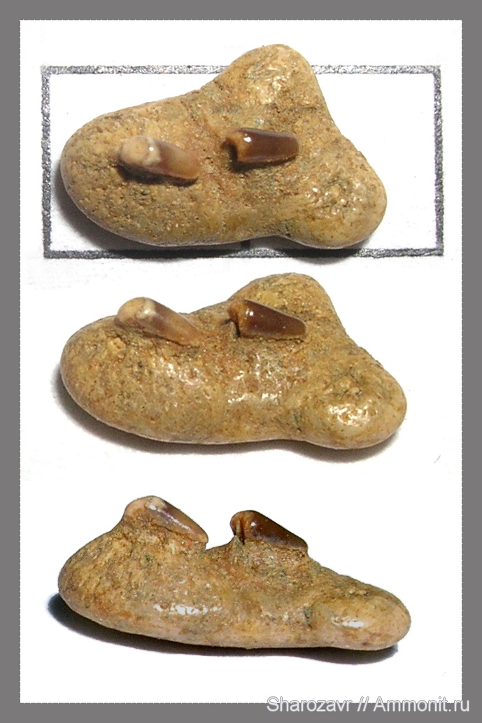 Странная конструкция, оставляет впечатление целого элемента с двумя, когда то острыми, направленными в сторону глотки зубами, который был расположен в челюсти или в глотке. Клетка 5 мм.
