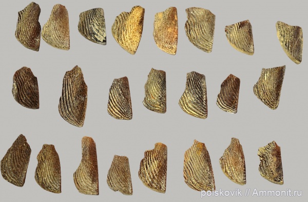 Передняя и задняя часть аптихов существенно отличаются по толщине. Обломана более тонкая часть. Среди сотен осколков (обнажения ими усеяны) эти - самые сохранные. | ||||||
