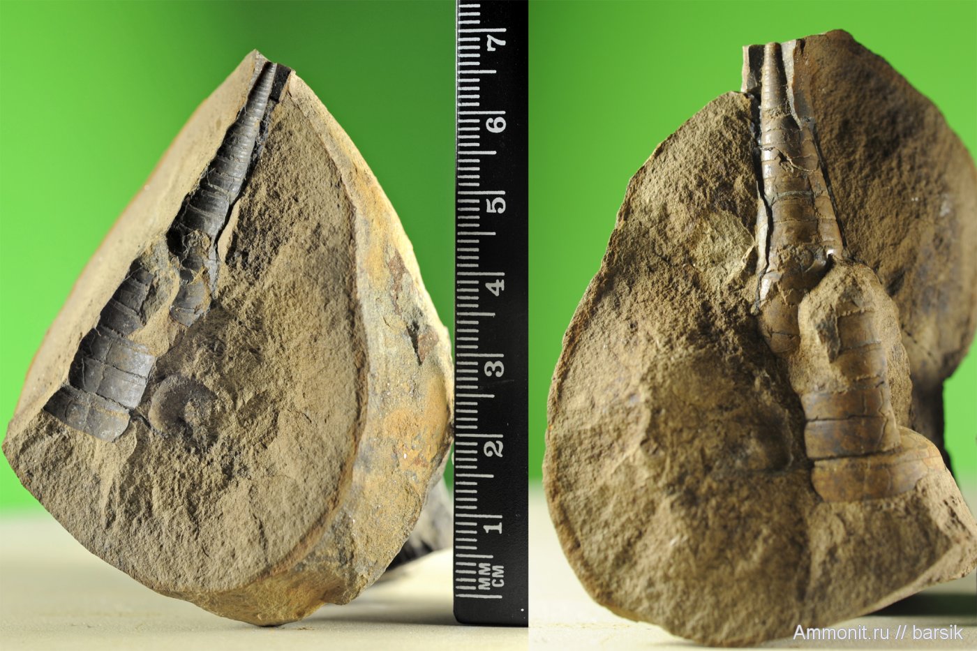 Деформированный фрагмокон белемнита и слева остатки ростра. Видимо в породе при формировании конкреции его два раза двинуло поперек оси.