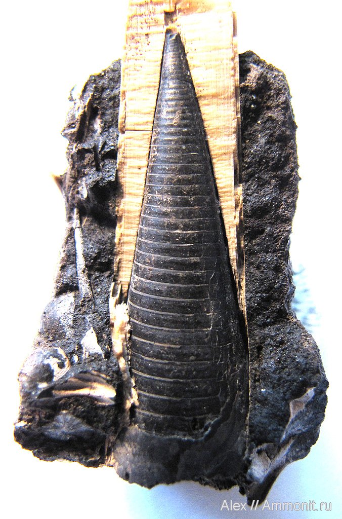 Целый фрагмокон белемнита длиной 3,5 см. Видно, что фрагмокон продолжается и вне основной части ростра, хотя у этого вида по ширине он не выходит за пределы ростра.