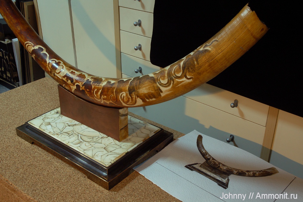 Заезжал в гости к знакомому художнику в мастерскую, отснял несколько работ по бивню разной степени завершенности (на фото одна из них)