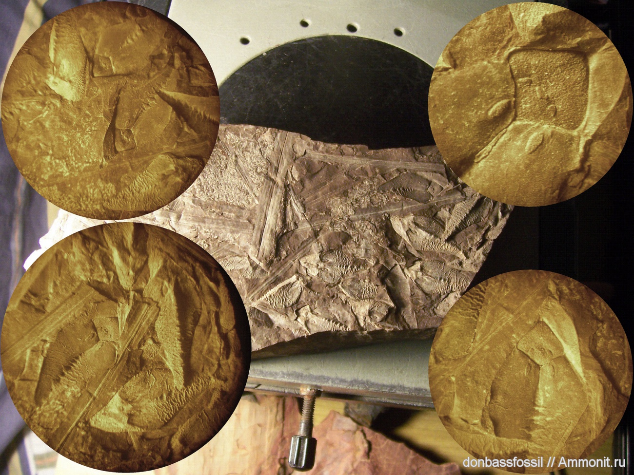 В литературе встречается информация о том, что лепидодендрон может сбрасывать листовые подушки. Это редкий случай, когда ЛП находятся в "свободном полете" и даже накладываются одна на другую. На фото фрагмент Lepidodendron aculeatum c неплохой сохранностью деталей.