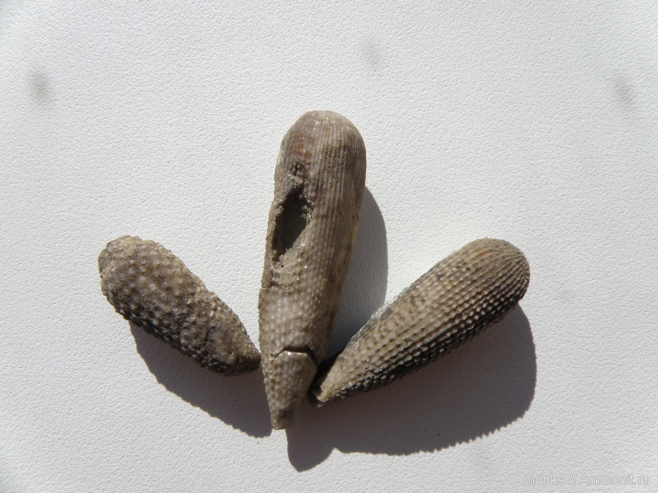 Место находки: побережье бухты Черепашка, подножье горы Сокол, Новый Свет. Игла слева - отличается формой и бугорками от двух остальных. Центральная игла имеет следы укусов.