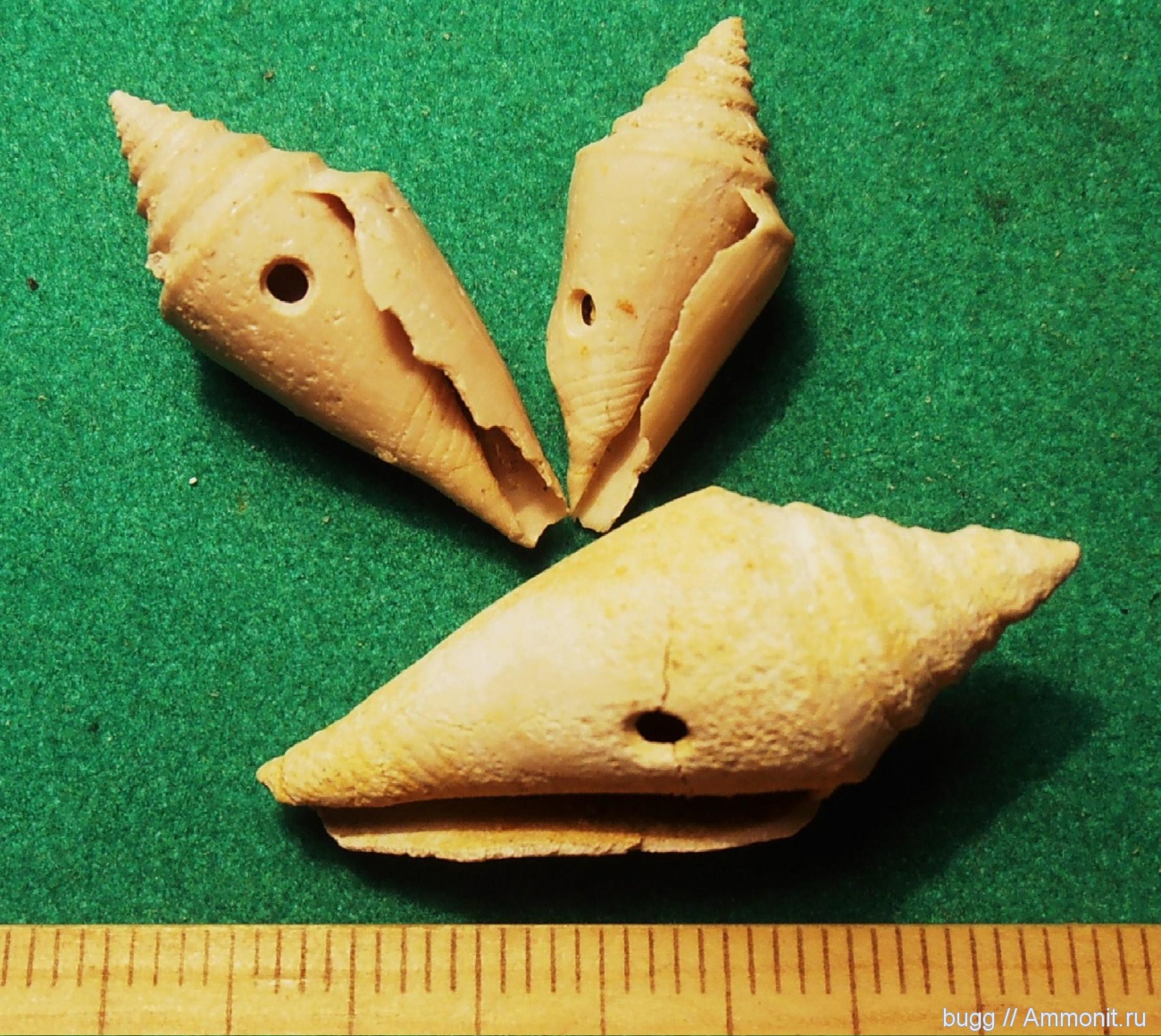 Эти гастроподы интересны тем,что возле устья у них находится отверстие от нападения хищного брюхоногого моллюска.Средняя гастропода на снимке еще и с залеченным прижизненным пореждением.