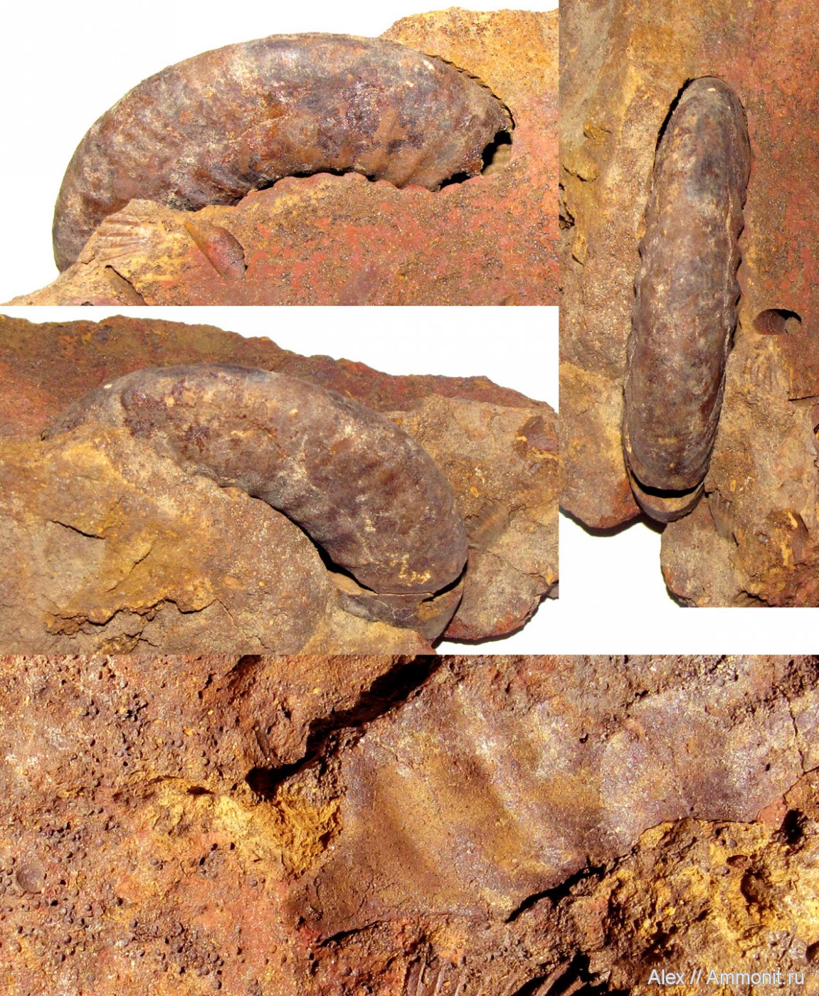 Жилая камера аммонита (Proplanulites sp.?) в красном нижнекелловейском мергеле. Диаметр раковины составлял более 10 см. К сожалению, кроме этого слепка жилой камеры от аммонита осталась только пустота в камне - раковина полностью растворилась.