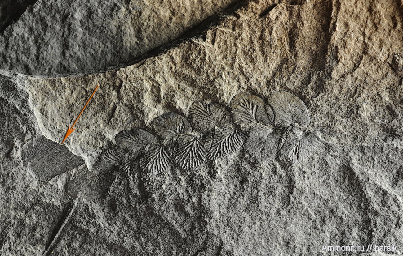 Птеридоспермы с характерным редким и рельефным жилкованием. Здесь, Neuropteris и Reticulopteris munsteri . , в комментариях обсуждение названия. Это не частая находка и по сравнению с Neuropteris их всего несколько фрагментов. Слева по стрелке часть листа Neuropteris и хорошо видно разницу в жилковании. Размер листа 40мм.
