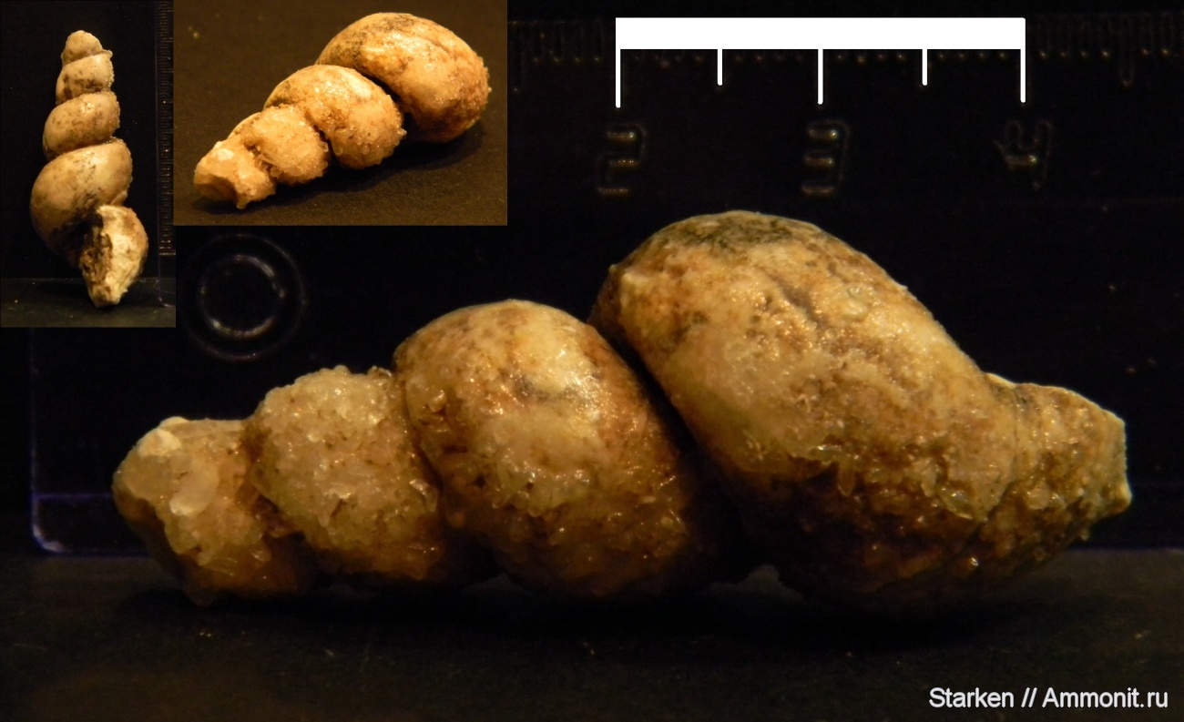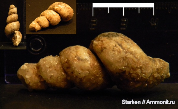 Ядро брюхоногого моллюска Palaeostylus с кристаллами кальцита из Щаповского оврага