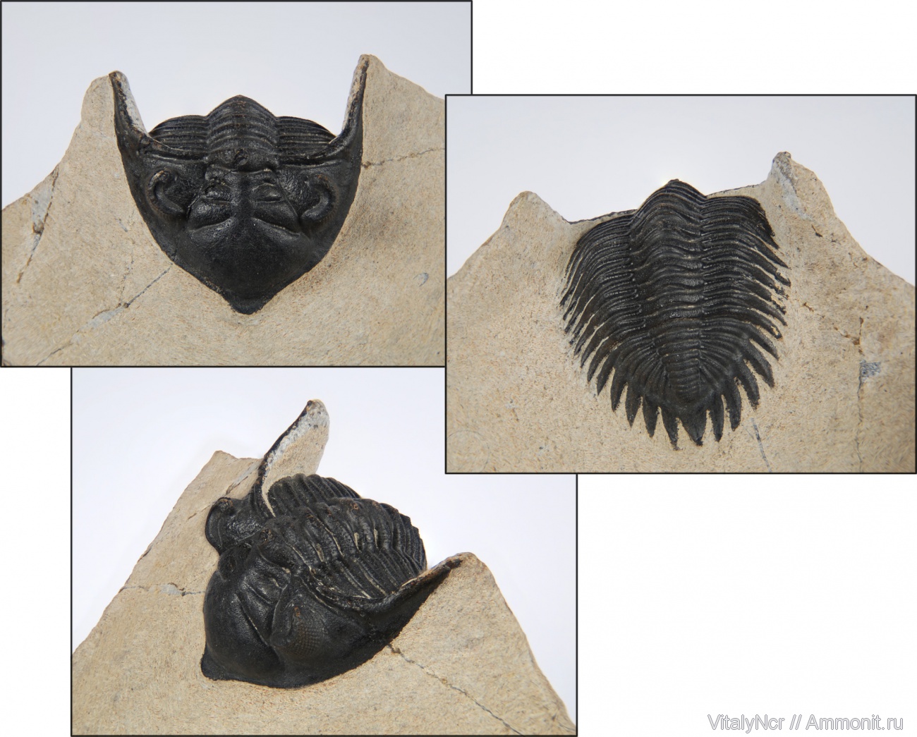Маленькая метакантина без затылочного шипа. Ему не повезло: прямо через него прошла первичная трещина при раскалывании породы, когда трилобит был найден, и обломок шипа был потерян.