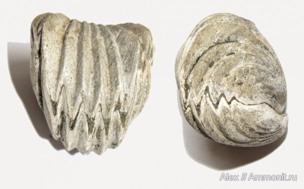 Раковина брахиоподы Mosquella oxyoptycha, вид с двух сторон.