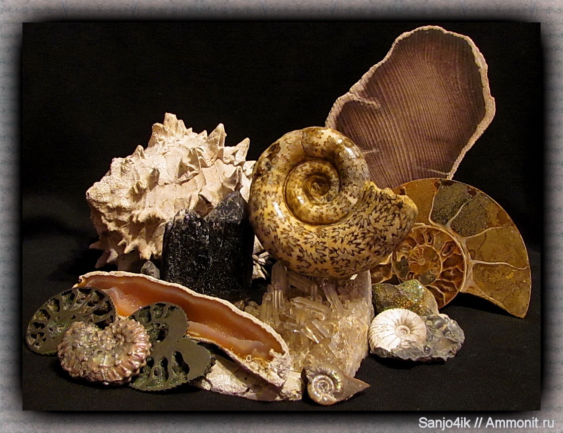 Красиво))) Особенно biasaloceras))) А хрусталь и морион (может волосатик)в море не росли...))). Но можно сказать "клад на дне палеоморя")))... И жеода красивая. Сердолик? | ||||||