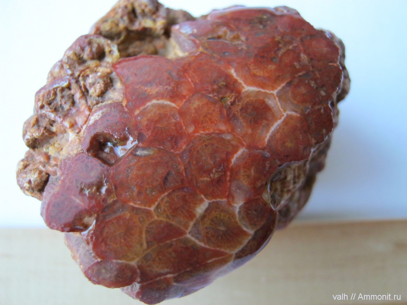 У американцев в штате Юта одиночные ругозы замещаются красным халцедоном. Называются red horn coral (из-за сходства с рогом) и используются в ювелирном деле. Отличный образец! | ||||||