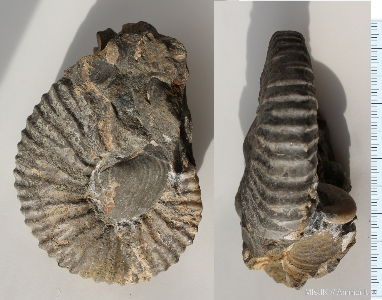 Настоящий Hypacanthoplites с плоским вентром и плоскими боками. В пупке примостилась двустворка, на правом фото виден 1,8 см аммонитик Phyllopachyceras.