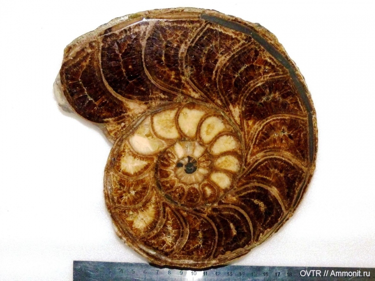 Полированная половина 22см аптского аммонита (Дагестан, Леваши). Абсолютно целые перегородки камер. Интересен двумя моментами: 1) обратите внимание, какая "бугристая" поверхность аммонита на первых оборотах - по-видимому, был шипастый в молодости, потом надобность в защите отпала - поверхность раковины стала ровной; 2) внизу - минерализованный кальцитом сифон, обычно он забит аргиллитом.