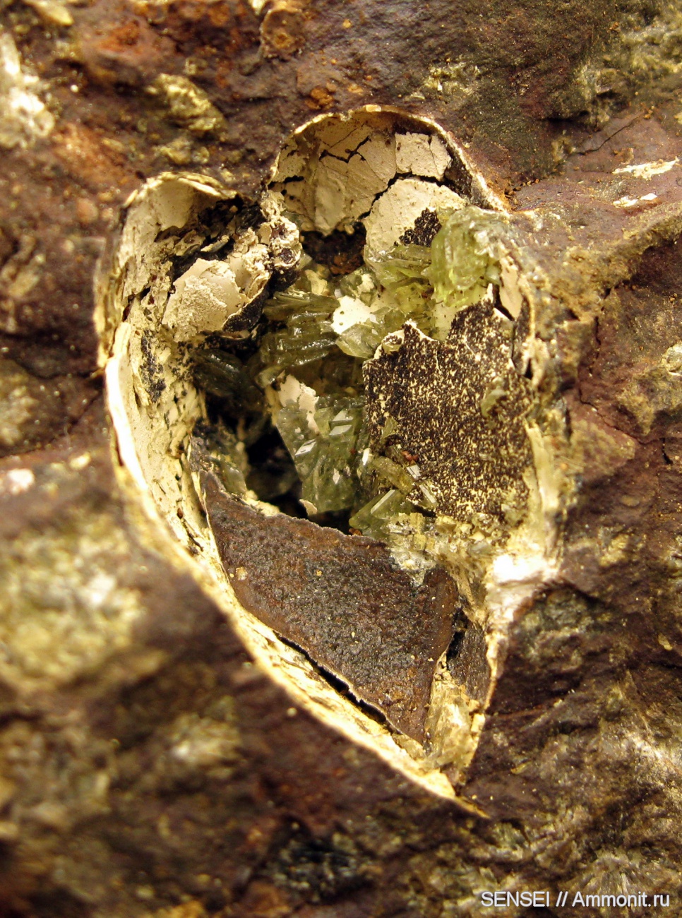 Как правильно указал ув.ulitka-в полостях;на этом же образце имеется небольшая полость в виде трещины,дак и там образовался небольшой кристалл анапаита. Спасибо,Дмитрий! | ||||||