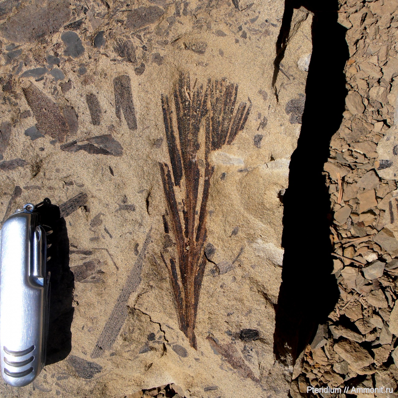 Один из самых интересных образцов, найденных в ходе полевой экскурсии в Мазуевку (находка Дмитро Пилипенко). Лист гинкгофита s.l. рода Mauerites Zalessky, названного выдающимся русским палеоботаником М.Д. Залесским в честь уральского краеведа-палеонтолога Г.Т. Мауэра (о нем можно прочитать в Палеомире, 2010, № 1-8, с. 70-77).
