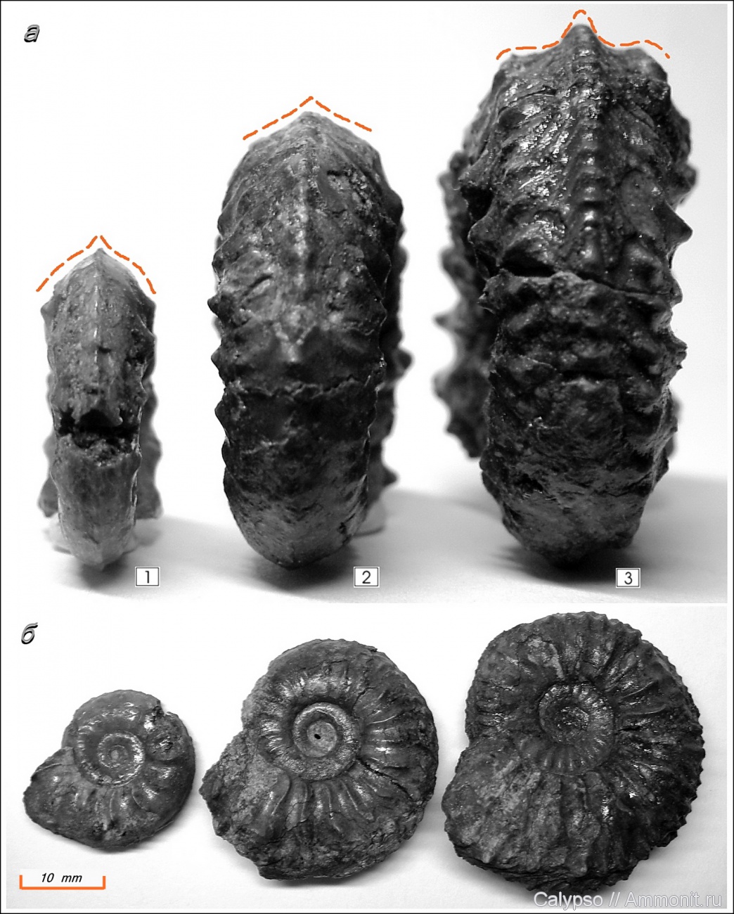 Хорошее сравнение, только с терминологией какой-то сбой. Написано что (а) - дорсально, (б) - вентрально, но на самом деле на фото (а) - вентрально, (б) - латерально. Вот ориентация раковин головоногих. Проще всего посмотреть на прямораковинного, у аммонита также, но просто завернуто. Боковые стороны = латеральные, внешняя, где у кардиоцерасов киль - это вентральная сторона (брюшная), а та которая с предыдущим оборотом соприкасается - дорсальная (спинная, аммонит затылком за предыдущий оборот держался).