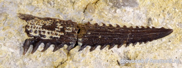 Он в абсолютно прижизненном очень хорошем состоянии. У моего куска треугольное сечение, умеренно уплощенный, сзади средней глубины желоб, крючья на задней части в 1 ряд или 2 не скажу, потому что нет верхушки в наличии, но скорее всего 2 ряда сливаются дистально. Передние шипы вообще умеренно-сигмоидальной формы в медиальном сечении; чем проксимальнее, тем на них больше выражены боковые кромки. Внутри полость с весьма толстыми стенками.