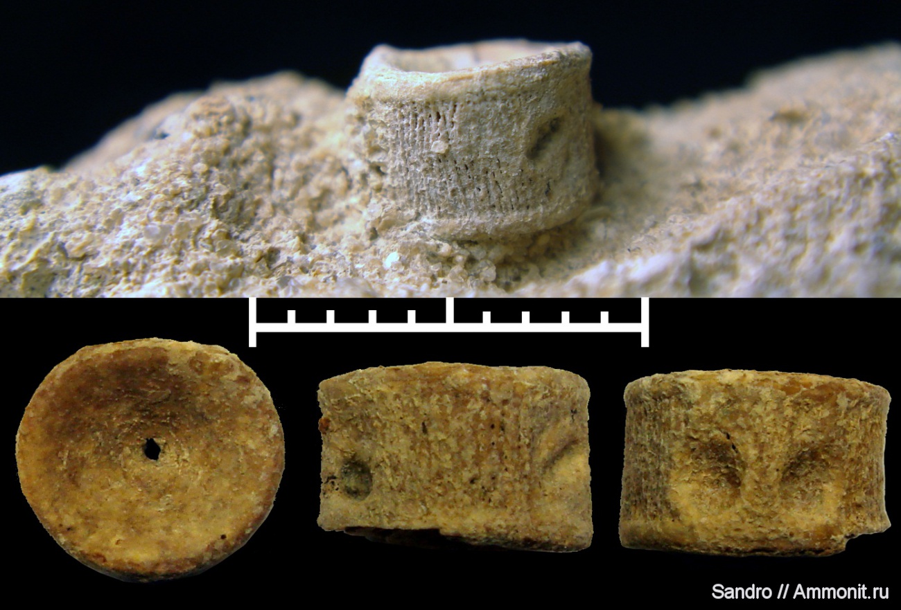 На верхнем виде хорошо просматриваются тонкие параллельные стяжки окостенения, характерные для позвонков акул.