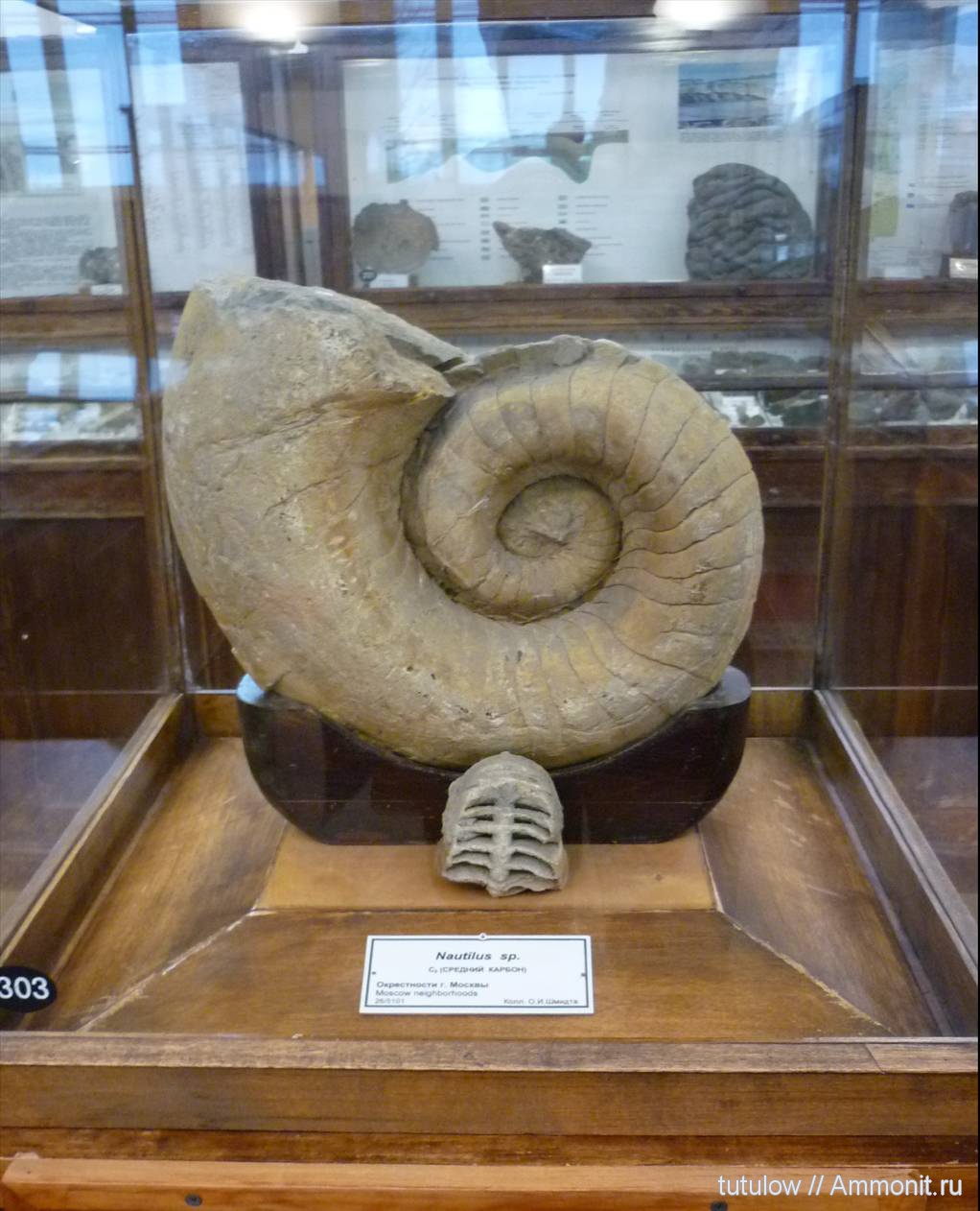 Название у него на табличке тоже неверно написано. Род Nautilus появился в Кайнозое, в карбоне даже семейств современных еще не было. Отряд да, Nautilida, а род скорее всего Lophoceras.