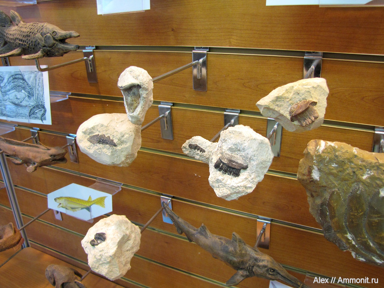 Эти зубы каменноугольных рыб я сфотографировал в экспозиции МДЭБЦ (бывший МосГорСюн). Зубы довольно крупные. Происходят из Московской области, вроде бы из Песков, хотя полной уверенности относительно точного места находки нет. Очень хотелось бы их определить.