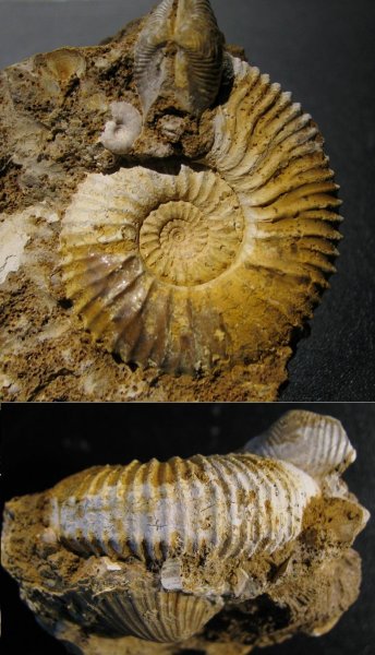 Очень хороший аммонит! Жалко, что устье под двустворкой скрыто, но зато они вместе хорошо смотрятся. | ||||||