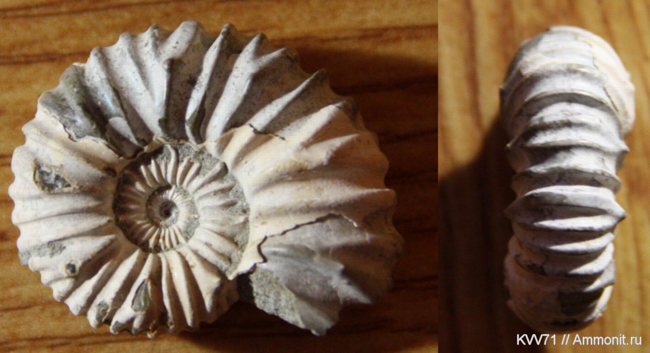 Скажите, по какой литературе Вы его определили? В атласе Друщиц В.В., Кудрявцев М.П. (ред.) (1960) Атлас нижнемеловой фауны Северного Кавказа и Крыма Parahoplites transitans выглядит и описывается совсем иначе - с заметно более узким пупком, быстрее расширяющимися оборотами и без шипов на боковых сторонах. Я бы сказал, что этот аммонит - Acanthohoplites, до A.bigoureti он не дотягивает, скорее всего Acanthohoplites aschiltaensis. | ||||||